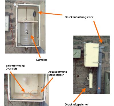 Die neu entwickelte Reinigungseinheit besteht aus einem Kasten mit einem Luftfilter, an den ein Druckluftspeicher mit 8 bar und ein Staubsauger angeschlossen sind. Im geschlossenen Kasten wird der Luftfilter bei eingeschaltetem Staubsauger mit einem Druckluftstoß gereinigt. Der Druck kann über ein Rohr entweichen, das so lang ist, dass die staubhaltige Luft nicht austritt. Der Staubsauger zieht zusätzlich Feinstaub ab. Durch diese Konstruktion wird die Freisetzung von Staub verhindert. Die Mitarbeiter sind vor Gesundheitsgefahren durch quarzhaltigen Staub geschützt. Die Filter werden in kürzester Zeit wirksam und schonend gereinigt. Der Entstehung von Silikose und damit vorzeitiger Berufsunfähigkeit und Krankheit wird vorgebeugt. Die Leistungsfähigkeit der Motoren bleibt gewährleistet.