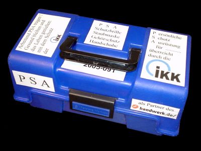 Die Schüler der Berufsbildenden Schule haben einen sog. PSA-Koffer erstellt. Dabei handelt es sich um einen handelsüblicher Kunststoff-Werkzeugkoffer, der mit PSA gefüllt ist: mit Schutzhelm, Handschuhen, Schutzbrille, Schutzmaske usw. Der PSA-Koffer stellt sicher, dass die Ausrüstung vor Beschädigungen und Verschmutzungen geschützt ist. Ziel ist es, das jeder Auszubildende seine Persönliche Schutzausrüstung vom ersten Ausbildungstag an zusammen mit seinem Werkzeugkoffer erhält und dafür auch verantwortlich ist. Zusätzlich wurde eine PSA-Gürteltasche entwickelt, sodass dadurch die PSA immer und überall griffbereit ist, auch wenn sie während der Arbeit nicht gebraucht wird. Durch einfache Mittel werden Mitarbeiter, in diesem Fall Auszubildende, dazu ermutigt, die PSA zu tragen und dafür zu sorgen, dass sie in einem ordnungsgemäßen Zustand ist. Es ist eine zusätzliche Motivationsmaßnahme, die für eine höhere Akzeptanz und Verfügbarkeit von PSA sorgt.