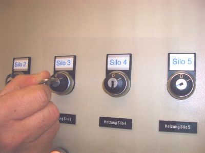 Zur Änderung der Verladesilo-Steuerung und der pneumatischen Anlage wurden fünf Schlüsselschalter im Schaltschrank der Verladesilo-Steuerung eingebaut. Jeder Schlüsselschalter betätigt die Klappen eines Silos und ist jeweils mit einem Schließer und einem Öffner bestückt. Beim Schalten des Schlüsselschalters wird die Siloklappe geöffnet und offen gehalten, ohne dass eine bleibende Betätigung des Tasters am Steuerpult notwendig ist. Um die Sicherheit des Mitarbeiters auch bei Stromausfall zu gewährleisten, wurde zwischen Magnetventil und Luftzylinder eine Absperrarmatur, ein sog. Kugelhahn, eingesetzt. Durch betätigen des Kugelhahnes ist ein pneumatisches Schließen der Klappe nicht mehr möglich. Liegt weder am Öffner- noch am Schließeranschluss des Zylinders Druckluft an, so fährt die Klappe durch ihr Eigengewicht langsam zu, ohne aber vollständig zu schließen. Durch den Umbau an der Steuerung sowie an der pneumatischen Anlage ist eine Gefährdung der Mitarbeiter weitestgehend ausgeschlossen. Durch diese Beiträge wurde ein wesentlicher Schritt zur Sicherheit bei regelmäßig auftretenden Reinigungsarbeiten an Silos im Asphaltmischbereich erreicht.