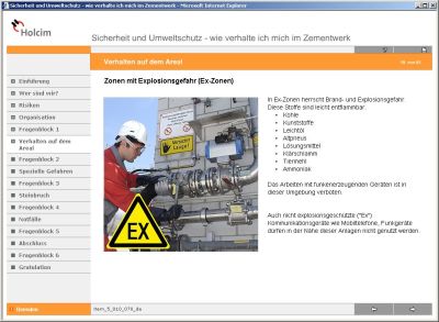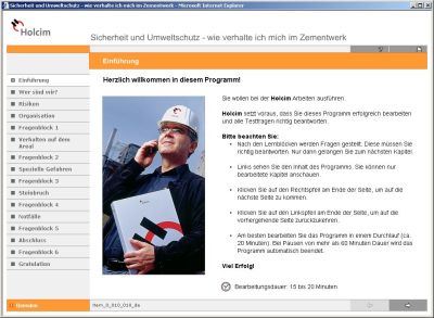 In einem Unternehmen der baustofferzeugenden Industrie sollte sichergestellt werden, dass alle Mitarbeiter, auch die Mitarbeiter von Fremdfirmen, die Sicherheitsstandards kennen und sich daran halten. Es sollte verdeutlicht werden, dass der Schulungsaufwand den Arbeitsablauf nicht beeinträchtigt, vor allem dann nicht, wenn Revisionsarbeiten im Unternehmen anstehen. Neben den Themen Arbeitssicherheit und Gesundheitsschutz stand auch das Thema Umweltschutz durch entsprechende Schulung im Mittelpunkt.