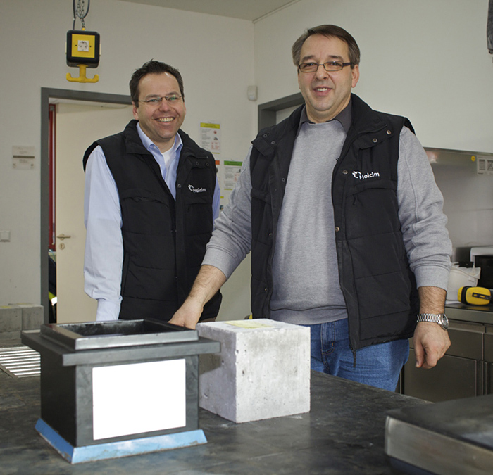 Werner Rohrmoser und Armin Engelberger suchten nach einer Lösung, die die aus Sicht des Arbeitsschutzes beschriebenen Unzulänglichkeiten beseitigt. Im Labor des Werkes Stuttgart der Firma Holcim Kies und Beton GmbH wurde dazu ein Rütteltisch modifiziert. Ein darin integrierter Magnet fixiert die Form während des Verdichtungsvorganges. Dadurch entfällt das gesundheitsschädliche Festhalten. Die Vibrationen werden besser in den Probekörper übertragen und das Schlagen des Metallbodens gegen die Metallplatte wird reduziert. Zusätzlich wurden an der Unterseite schalldämmende Materialien angebracht.