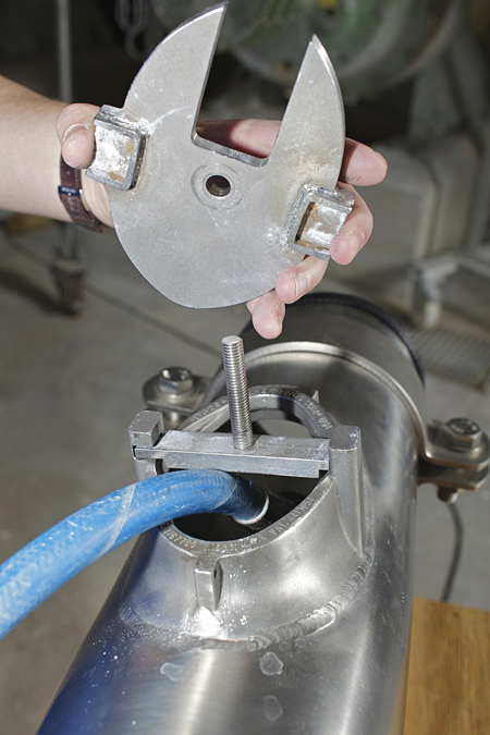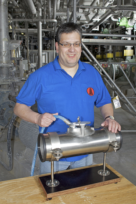 Um dies zu verhindern, entwickelte Torsten Hoffmann einen Deckel, der als Fangvorrichtung dient. Nach Einführung des Hochdruckschlauches in das zu reinigende Rohr wird die Reinigungsöffnung durch den Deckel verschlossen. Der Schlauch bleibt dabei im Rohr frei beweglich, das Schlauchende mit der Düse kann aber nicht austreten. Der innovative Deckel mit der notwendigen Arretierung für die Reinigungsöffnung ist zweckorientiert gestaltet und kann schnell und unkompliziert mittels einer Flügelmutter montiert werden. Da die Reinigungsöffnungen weitgehend einheitlich ausgeführt sind, kann eine einzige Fangvorrichtung universell an vielen Rohröffnungen verwendet werden.