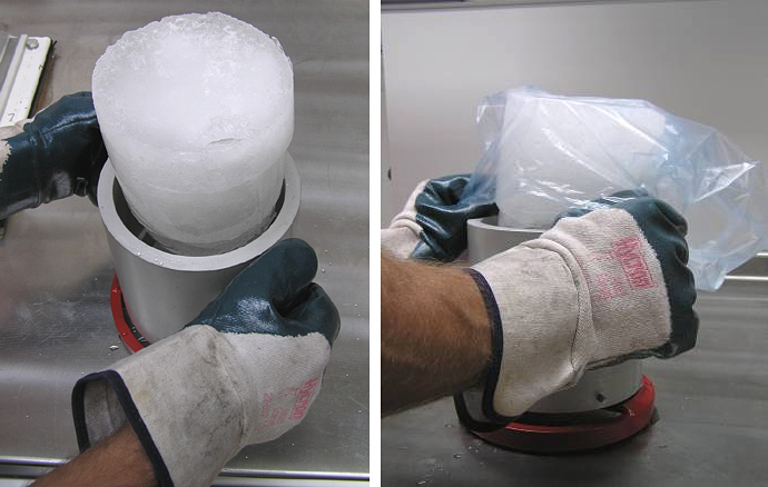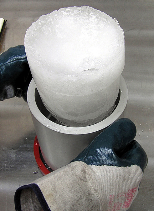Das Gewicht einer Eiskerze muss mindestens 1.200 Gramm, ihre Kerntemperatur muss -15 Grad Celsius betragen. Herkömmliche Gefriertruhen sind zur Herstellung nicht geeignet.
