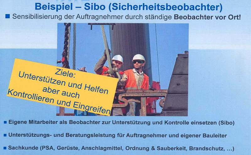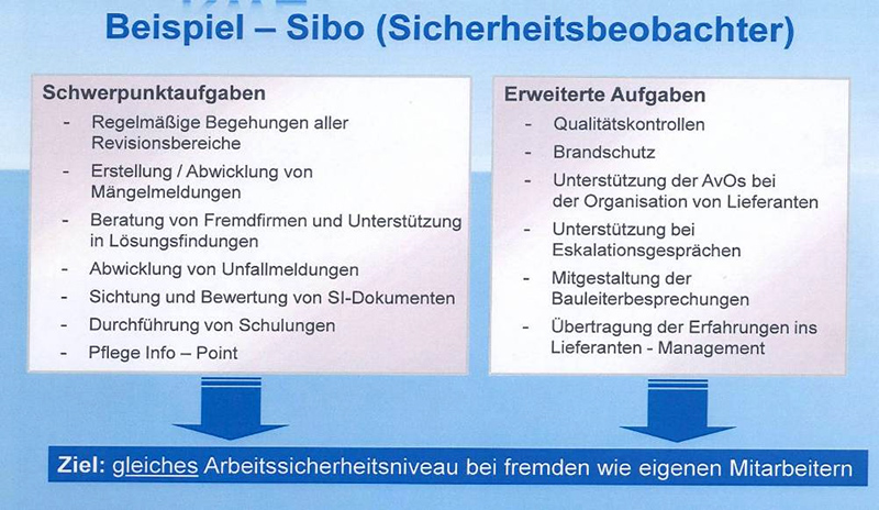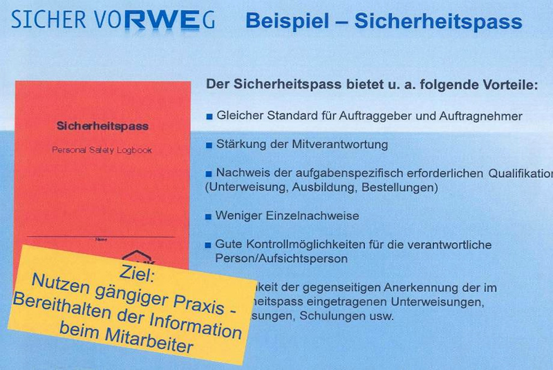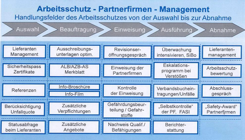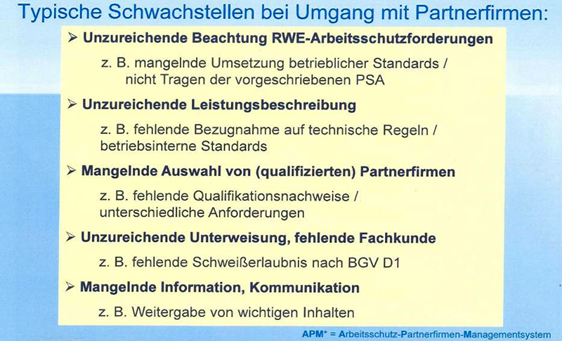 Für umfassende Informationen wurde ein Workshop für Partner zum Thema RWE-Arbeitsschutzkultur und Verhalten der Mitarbeiter eingerichtet. Einen hohen Stellenwert bei der praktischen Umsetzung nimmt die Berücksichtigung von Referenzen bei der Bestellung von Lieferanten (Auswahl, Bewertung, Klassifizierung, Weiterentwicklung) ein. Grundsätzlich ist ein Sicherheitspass erforderlich, der aufgabenspezifische Qualifikationen dokumentiert. Es erfolgt eine Vorhaltung der Gefährdungsbeurteilung der Partnerfirmen bei allen Tätigkeiten vor Ort. Sicherheitsbeobachter überwachen die von den Partnerfirmen vorgeschlagenen Optimierungen und Abhilfemaßnahmen vorrangig bei Großrevisionen, Instandhaltungen und dem Einsatz vieler Partnerfirmenmitarbeiter.
