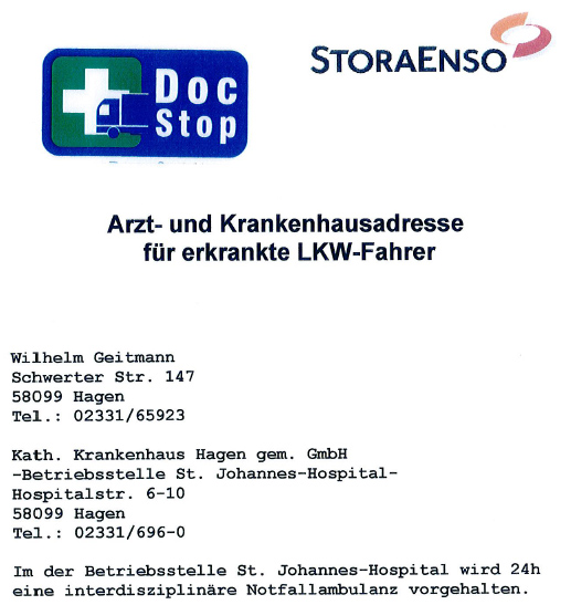 „Doc Stop“ ist ein medizinisches Versorgungskonzept für Berufskraftfahrer/Fernfahrer. Seit vier Jahren sind alle Toreinfahrten des Werkes mit dem offiziellen Symbol „Doc Stop“ gekennzeichnet. Lkw-Fahrer können vom Pförtner auf Anfrage eine aktuelle Arztadressenliste inklusive Wegbeschreibung erhalten. Falls es zu Sprachschwierigkeiten oder Übersetzungsproblemen kommen sollte, kann der Pförtner den neuen Notfall-Sprachenplan zur Hand nehmen. Beide Maßnahmen unterstützen durch zielorientierte Konzepte die Versorgung im medizinischen Ernstfall.