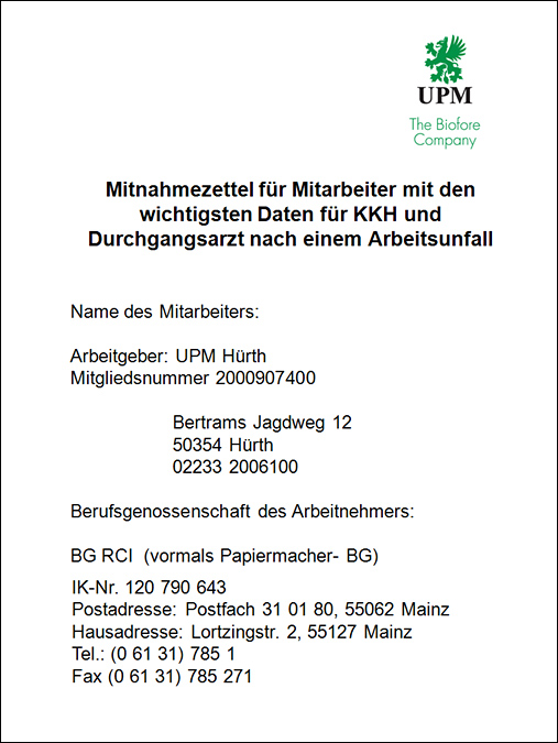 Durch die Zusammenschlüsse mehrerer Berufsgenossenschaften entstand bei vielen Mitarbeitern ein Aktualisierungsbedarf hinsichtlich der Kontaktdaten ihrer zuständigen Berufsgenossenschaft im Falle eines Arbeitsunfalls. Um diese Daten für den Notfall verfügbar zu halten, hat die UPM, Hürth, einen so genannten „MY Safety+“-Abrisszettel entworfen, der dem Verunfallten, seiner Begleitperson oder dem Krankentransport mitgegeben wird.