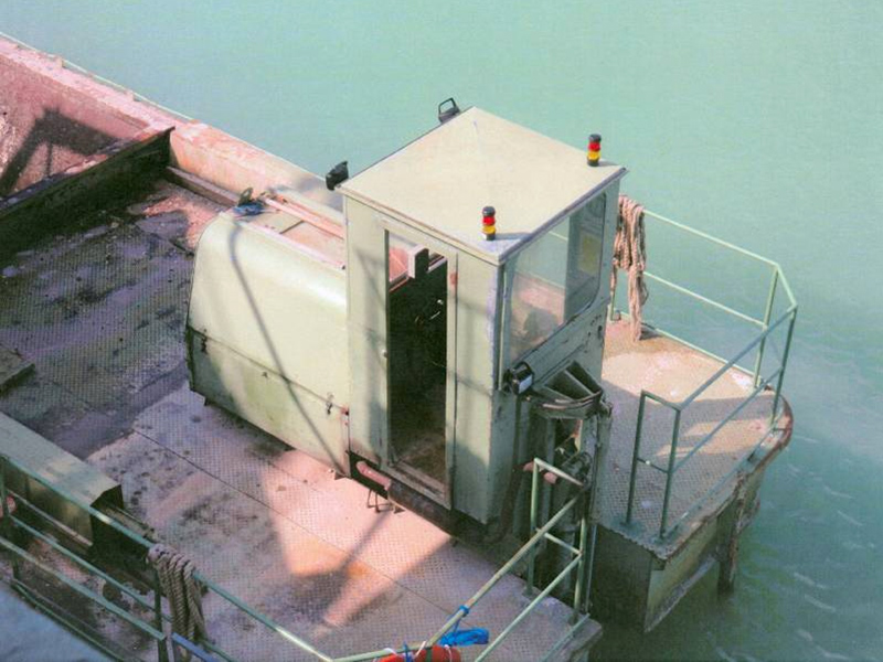 Auf der Schute ist deshalb ein Instrument installiert, das ihre Neigung misst. Die Signale der Messeinrichtung werden an eine skalierte Kontrolleinheit im Fahrstand geleitet. Der Bediener des Schwimmgreifers ist jetzt in der Lage, die Neigungen gradweise nach Backbord und Steuerbord abzulesen. Zusätzlich ist auf dem Dach des Fahrerstandes je eine Warnleuchte für jede Seite installiert, die bei Erreichen der fünf Grad-Neigung rot leuchtet. Der Ladevorgang muss daraufhin beendet werden.