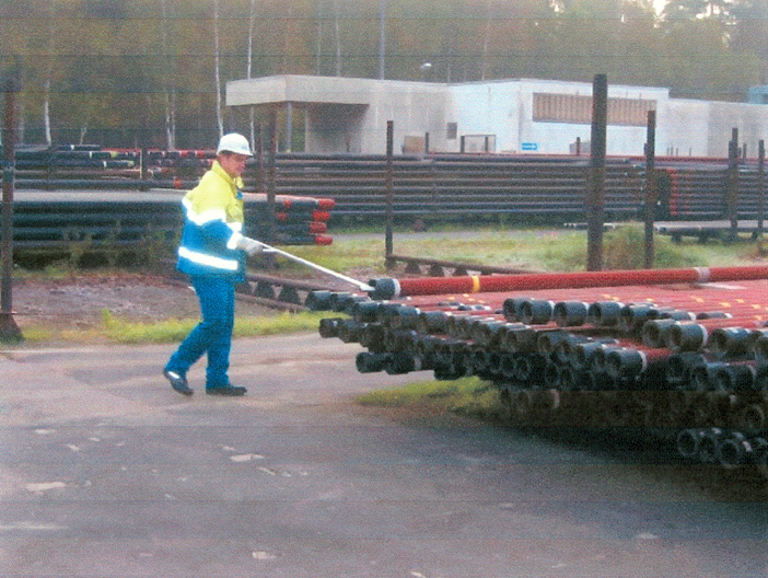 Steigrohre der Erdöl- und Erdgas-Industrie mit einem Außendurchmesser von bis zu 20 Zentimetern werden auf Stapeln gelagert. Zur Entnahme betreten Mitarbeiter den Rohrstapel über eine Leiter und rollen die Rohre zum Ende des Stapels. Um die Unfallgefahr zu minimieren, hat die ExxonMobil Production Deutschland GmbH, Hannover, ein Hilfsmittel entwickelt, mit dem die Rohre vom Boden aus bewegt werden können.