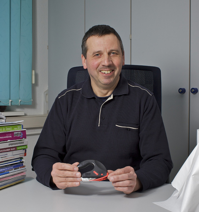 Mit kleinen, aber entscheidenden Veränderungen an dem Messer konnte erreicht werden, dass ein unbeabsichtigtes Auslösen des Arretierungsbolzens ausgeschlossen ist. Der Sonderpreis 2012 der Branche Leder geht an Frank Borrmann, der mit kleinen konstruktiven Änderungen zu einer wesentlichen Reduzierung der Zahl der Schnittverletzungen beigetragen hat.
