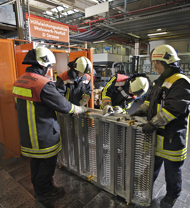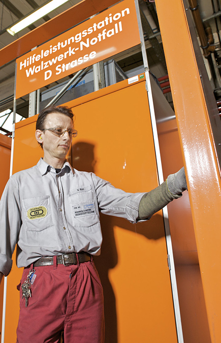An jedem Walzwerk ist eine Hilfeleistungsstation platziert, in der von der Leiter über Spezialwerkzeuge, Verbandsmaterial bis zur persönlichen Schutzausrüstung für die Rettungskräfte alles Notwendige zu finden ist.
