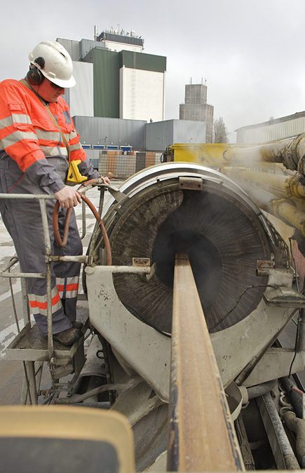 Ausgehärtete Betonreste in Fahrmischertrommeln werden durch einen Mitarbeiter mit Hilfe eines Stemmhammers entfernt. Gefährdungen entstehen durch Lärm, Staub, Betonsplitter und scharfe Kanten. Zusätzlich bedeutet die Tätigkeit eine Zwangshaltung. Die Blascon Industrielle Reinigungen GmbH, Nordhorn, führt die Reinigungsarbeiten mittels Hochdruckwasserstrahl durch.