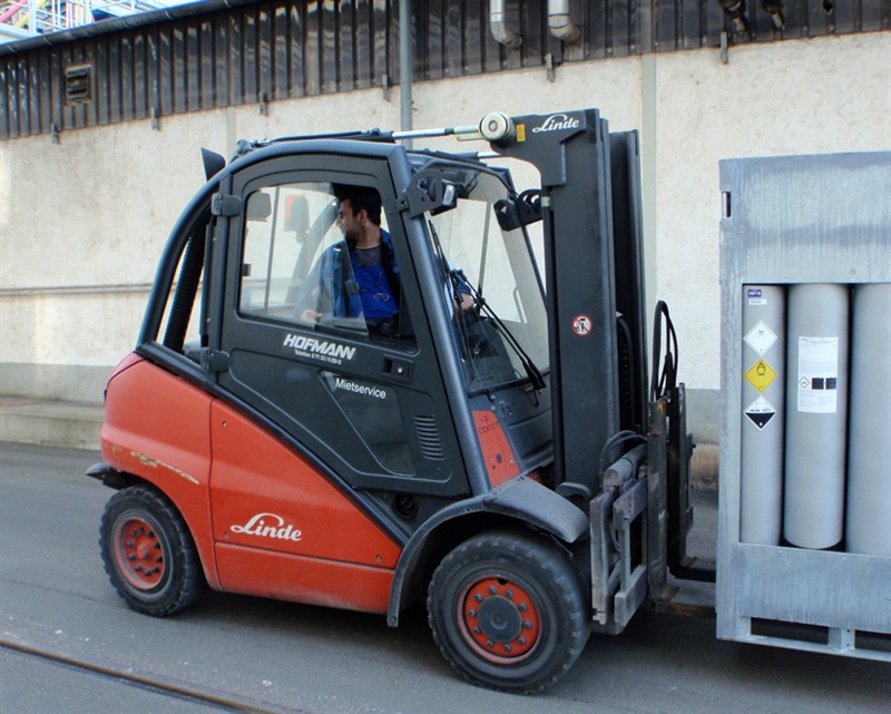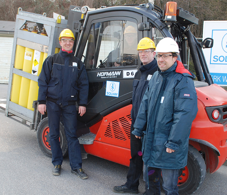 Solvay ist ein international tätiges Chemieunternehmen mit weltweit 29.000 Mitarbeitern. Als Hersteller von Fluorprodukten, die in der Kältetechnik, der Schaumstoff- und Löschmittelherstellung sowie in der Halbleiterindustrie zum Einsatz kommen, ist Solvay die Nummer zwei auf dem Weltmarkt. Der Transport von Fluorflaschenbündeln im Werk Bad Wimpfen erfolgt per Gabelstapler. Durch die Größe des Ladegutes ist die Sicht nach vorn eingeschränkt.