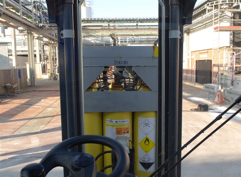 … die Größe des Ladegutes, wie hier die Fluorflaschenbündel im Solvay-Werk in Bad Wimpfen, die Sicht in Fahrtrichtung extrem behindert.