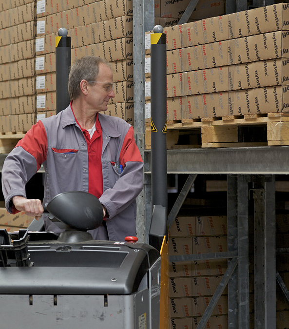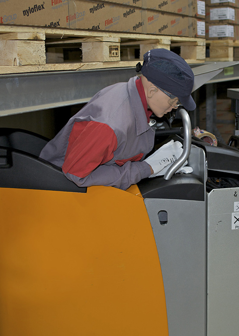 Bei Nieder- oder Hochhubwagen mit Mitfahrerplattform drohte bislang die Gefahr, bei unvorsichtiger Navigation unter Regalböden in Brusthöhe eingequetscht zu werden. Bediener dieser Flurförderfahrzeuge sind nicht wie beim Gabelstapler durch die Karosserie geschützt.