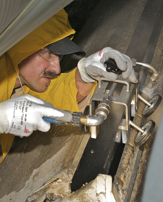 Die neue Konstruktion macht dieses Vorgehen überflüssig. Ein Reinigungsaufsatz wird auf die Pistole eines Hochdruck-Flüssigkeitsstrahlgerätes geschraubt. Beide bewegen sich quer zur Papierbahn über die Stofflauflamelle mithilfe eines Rollsystems. Zwei Düsen erfassen dabei gleichzeitig die Vorder- und Rückseite der Lamelle.