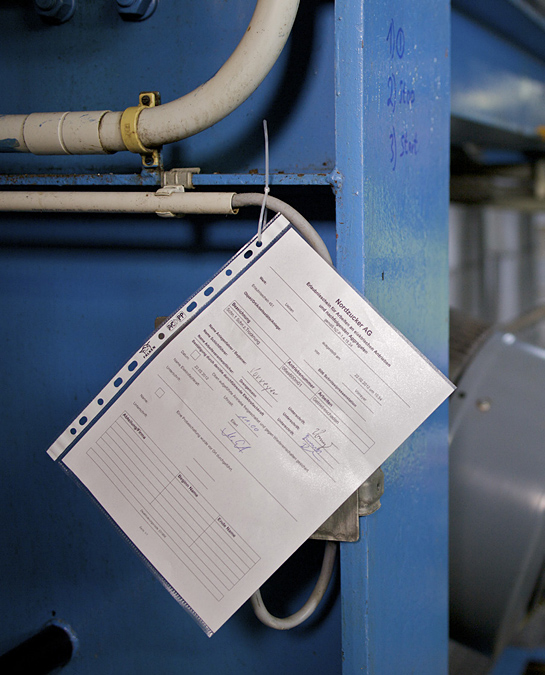 Über das Intranet des Unternehmens können Mitarbeiter die Erlaubnisscheine anlegen, einsehen oder deaktivieren. Alle Daten werden zentral erfasst und stehen jederzeit zur Verfügung. Der am Rechner erstellte Schein wird ausgedruckt, unterzeichnet und an der Arbeitsstelle hinterlegt. Gleichzeitig wechselt der Status der betroffenen Anlage. Nach Abschluss der Arbeiten wird der Schein über den Code am unteren Rand des Dokumentes im System deaktiviert und der Betriebsstatus geändert. Doppelt ausgefüllte Erlaubnisscheine werden damit sicher vermieden. Zugleich erhalten alle Beteiligten mehr Transparenz über aktuell freigeschaltete Antriebe.