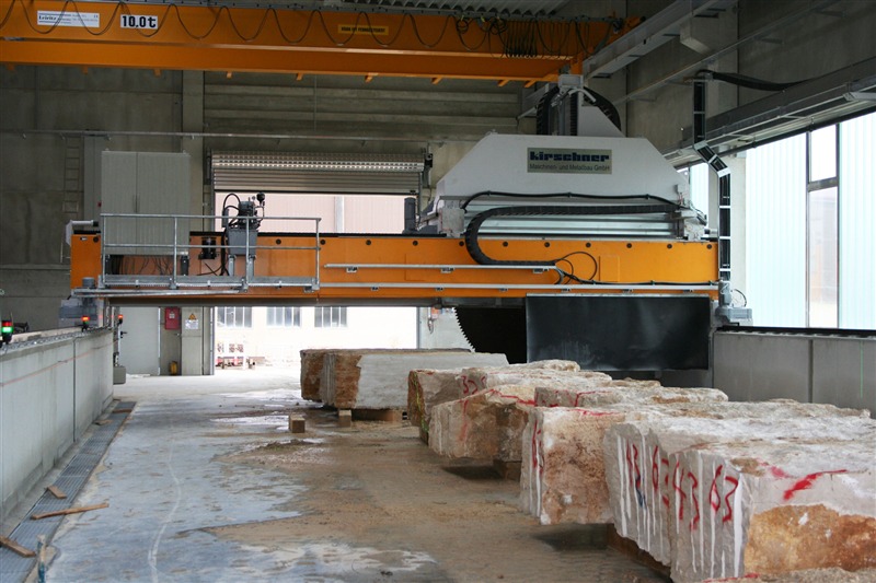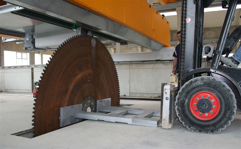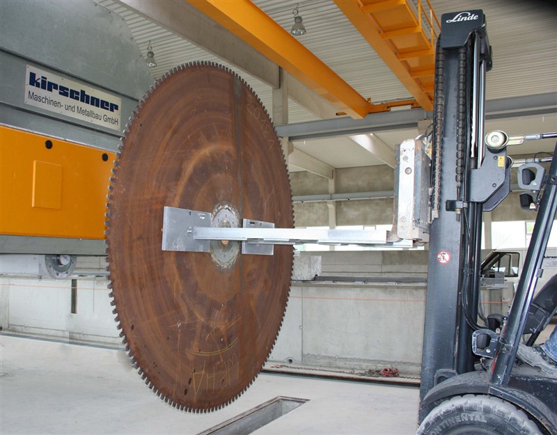 Die Natursteinindustrie setzt Blocksägen ein, deren Sägeblätter einen Durchmesser von bis zu 3,5 Metern besitzen. Der regelmäßige Wechsel dieser Sägeblätter ist zeitintensiv und unfallträchtig, da sich Mitarbeiter an den Sägeblättern verletzen können. Die Kirschner Maschinen- und Metallbau GmbH, Greding, hat eine Vorrichtung zum schnellen und sicheren Sägeblattwechsel per Gabelstapler entwickelt.