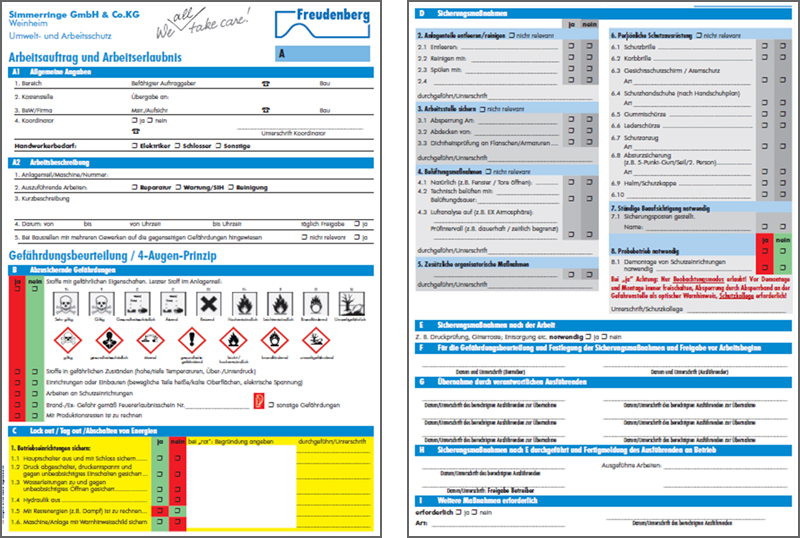 Bei Reparatur-, Wartungs- und Instandhaltungsarbeiten kommt es immer wieder vor, dass Handwerker verschiedensten Gefährdungen ausgesetzt sind. Schutzeinrichtungen müssen teilweise demontiert oder deaktiviert, Testläufe ohne Schutzeinrichtungen durchgeführt werden und das Arbeiten in der Nähe von Gefahrstellen lässt sich teilweise nicht vermeiden. Die Freudenberg Simmerringe GmbH & Co. KG, Weinheim, führt in diesen Fällen eine spezielle Gefährdungsbeurteilung durch.