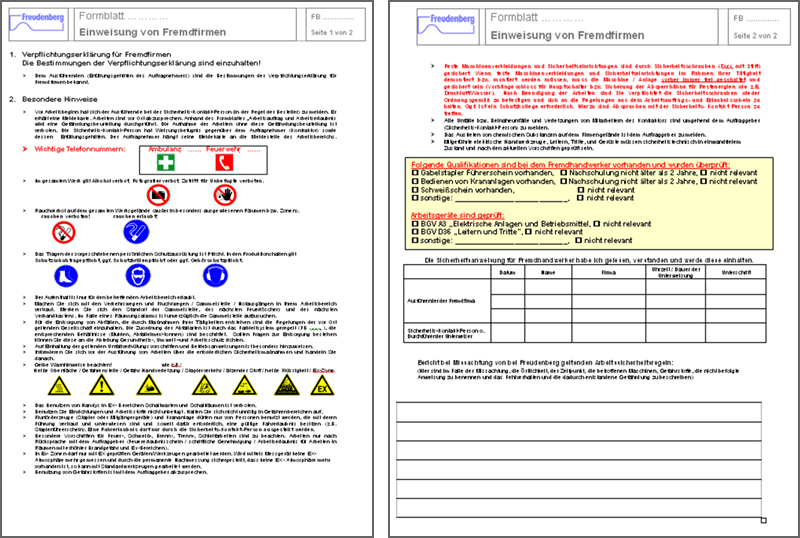 Bei Auftragsvergabe an Fremdfirmen wird zusätzlich zum A- und E-Schein ein Formblatt zur Verfügung gestellt, mit dessen Hilfe eine Einweisung von Fremdfirmen erfolgt. Vermerkt sind etwa Notfallrufnummern und innerbetriebliche Regelungen. Seit der Einführung dieses Projekts ist bei diesen Tätigkeiten kein Unfall mehr gemeldet worden.