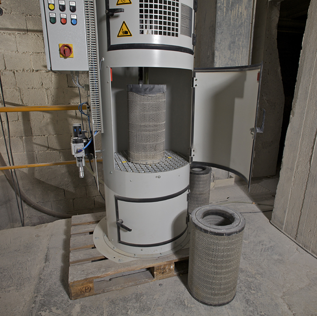Eine rotierende Druckluftdüse reinigt die Luftfilterpatronen in einem geschlossenen System nach einem voreingestelltem Programm. Staubpartikel werden abgesaugt und größere Verschmutzungspartikel in einer Wanne aufgefangen.