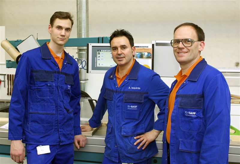 In Ludwigshafen entstehen unter anderem Exponate, maßgeschneiderte Inneneinrichtungen und Produktionswerkzeuge aus Holz. Das Unternehmen Holztechnik Plus unterstützt die Forschung bei der Entwicklung neuer BASF-Produkte und ist auch Partner in der Pre-Marketingphase. In der Werkstatt des Unternehmens Holztechnik Plus wurden an Tisch- und Formatkreissägemaschinen seit Jahren gute Erfahrungen mit einer Schutzvorrichtung gemacht, die von der ehemaligen Holz-Berufsgenossenschaft entwickelt worden und unter dem Namen „Fritz + Franz“ bekannt war. Mithilfe dieser Schutzvorrichtung können vor allem kleinformatige Teile gefahrlos bearbeitet werden, wobei das zu bearbeitende Werkstück in die Schutzvorrichtung eingespannt ist.
