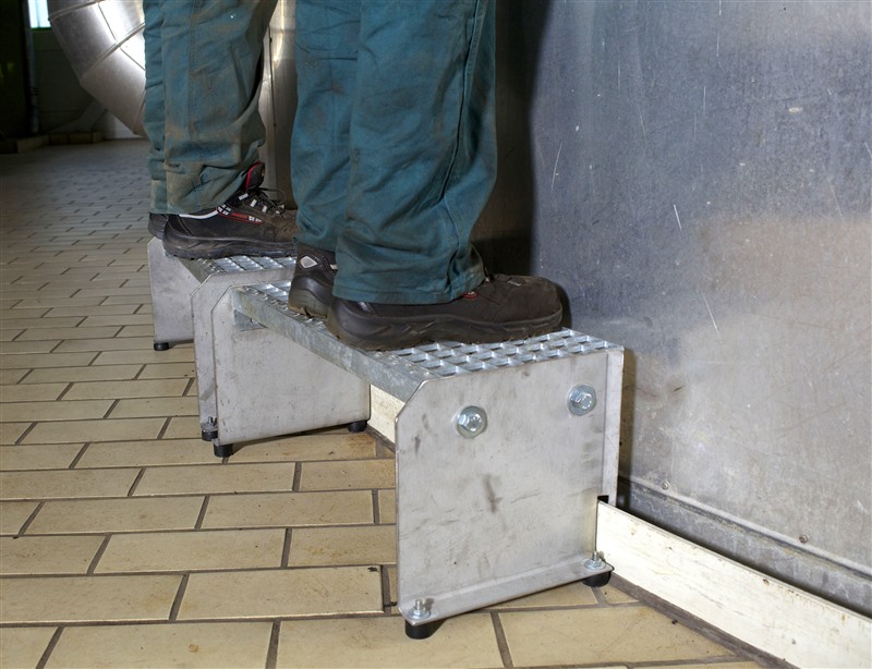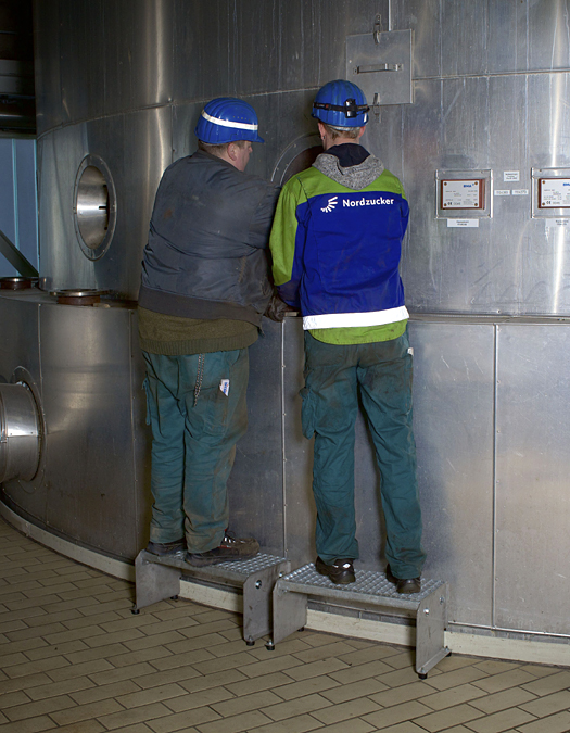 Daher suchten sie nach einer besser anwendbaren Lösung und entschieden sich für kleine Tritte. Diese ermöglichen den Höhenausgleich und sind an den festen Schutzring um die Verdampfungstrockner sicher und ohne Gefahr des Verrutschens angedockt. Auch lassen sich die Tritte durch ihr geringes Gewicht einfach versetzen. Durch diese einfache Maßnahme lassen sich Sichtkontrolle, Entstörungs- und Instandsetzungsarbeiten an den Schaugläsern nun deutlich sicherer durchführen.