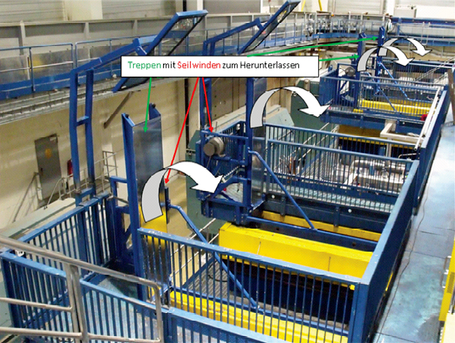 Die Schachteinstiege an der Stirnseite der Schleifertaschen wurden vollständig neu gebaut. Die Einstiege, die als absenkbare Treppen mit Handlauf ausgeführt und elektronisch gesichert sind, bilden die Zugangsverwehrung. Nach Erfüllen der Sicherheitsanforderungen werden die Treppen freigegeben und über Seilwinden abgelassen. Auf der Unterseite der Treppen wurden Blechplatten angebracht. Sie schützen gegen aufsteigenden Dampf aus der geöffneten Luke. Somit werden die Verbrühungsgefahr und die Gefahr des Ausrutschens bei Beschlagen der Treppe ebenfalls minimiert.