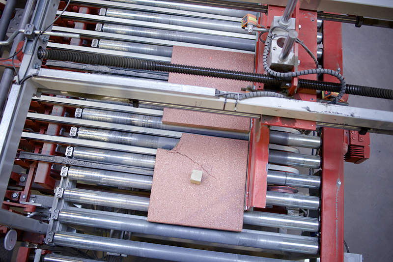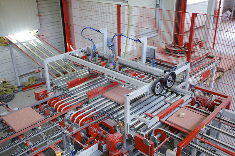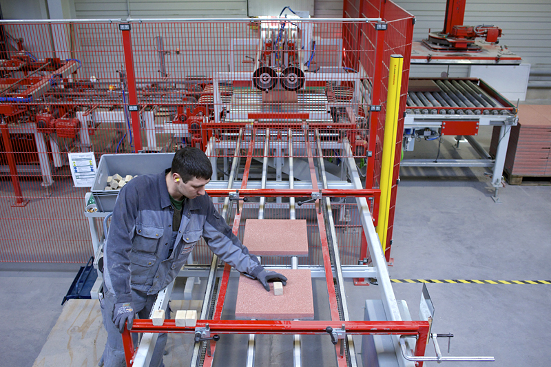 Liegt es flach, deutet es der Scanner als II. Wahl. Steht es aufrecht, identifiziert er es als Ausschuss. Dementsprechend werden die so markierten Betonsteine automatisch auf verschiedene Förderbänder geleitet und schließlich auf Paletten abgelegt bzw. aussortiert.