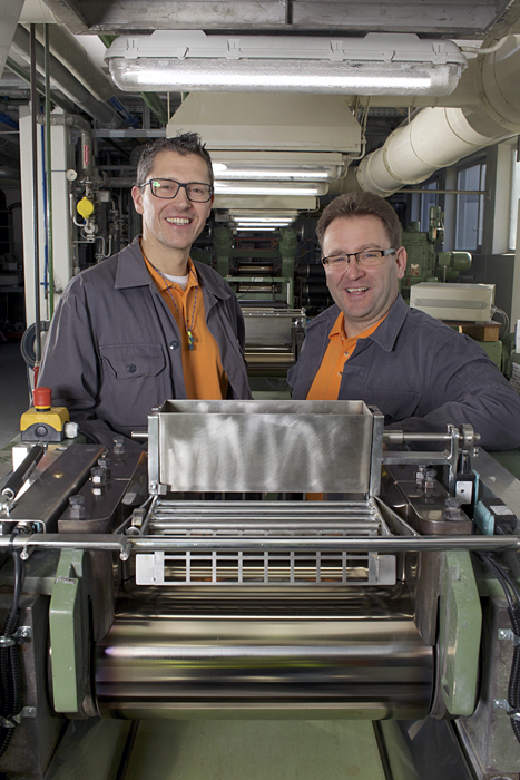 Gesucht wurde nach einem System, das diese Gefährdung beseitigt oder auf ein Minimum reduziert, gleichzeitig die Arbeit am Walzwerk aber nicht wesentlich beeinträchtigt. In vielen Entwicklungsschritten wurde eine Schutzvorrichtung konstruiert, die gewährleistet, dass der Maschinenbediener nicht an den Walzenspalt gelangen kann, solange die Maschine läuft. Dabei wurde besonderes Augenmerk darauf gelegt, dass die verschiedenen hier vorkommenden Anforderungen an die Maschine erfüllt werden. Auch wurde sichergestellt, dass die Reinigung der Maschine gefahrlos durchgeführt werden kann; die Sicherheitsvorrichtung kann zu diesem Zweck aufgeklappt werden. Dabei wird der Antrieb der Maschine automatisch ausgeschaltet.