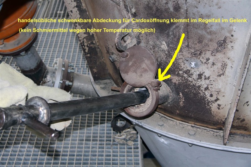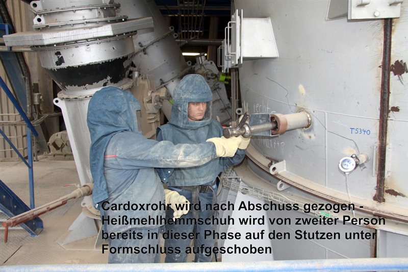 Ein findiger Mitarbeiter der Deuna Zement GmbH hat eine Vorrichtung entwickelt, mit der die Öffnung unmittelbar nach der Entnahme des Cardoxrohres verschlossen werden kann. Dieser sogenannte Heißmehlhemmschuh besteht aus einem rechteckigen Metallgehäuse mit einem Griff auf der geschlossenen Oberseite. Das Gehäuse ist auf der Unterseite vollständig offen und auf der Rückseite so weit ausgeschnitten, dass die Vorrichtung passgenau auf den Cardoxstutzen aufgeschoben werden kann. Vor dem Herausziehen des Cardoxrohres wird der Heißmehlhemmschuh seitlich an den Stutzen angesetzt. Ist das Rohr vollständig herausgezogen, schiebt ein zweiter Mitarbeiter den Hemmschuh unverzüglich über die Stutzenöffnung. Somit wird ein Heißmehlaustritt effektiv verhindert und das Cardoxrohr kann ohne Hektik abgelegt werden. Die Verschlusskappe kann angesetzt und nach dem Zurückziehen des Hemmschuhs in die Cardoxöffnung eingeschraubt werden.