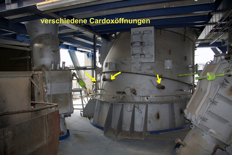 Für die Beseitigung der Anbackungen wird ein Druckgasverfahren, das sogenannte Cardoxverfahren, angewendet. Hierfür wird ein mit CO2 gefülltes Rohr durch spezielle Stutzen in das Zykloninnere eingebracht. Diese Stutzen besitzen eine Klappe, die pendelfähig vor der Öffnung angebracht ist. Die Klappe wird zur Seite bewegt, das Rohr eingeführt und ein Gasstoß löst die Anbackungen. Nach dem Herausziehen des Rohres aus dem Stutzen sollen die Pendelklappen eigentlich von selbst wieder vor die Öffnung fallen, damit es nicht zu einem unkontrollierten Auslaufen von Heißmehl kommt. Trotz Hitzeschutzkleidung kann das heiße Material den Mitarbeitern schwere Verbrennungen zufügen, wenn es z. B. zwischen Jackenärmel und Handschuh läuft. Diese Pendelklappen korrodieren jedoch sehr schnell und verlieren dadurch an Beweglichkeit.