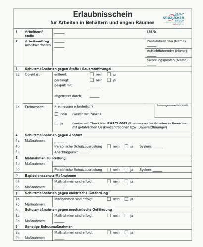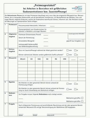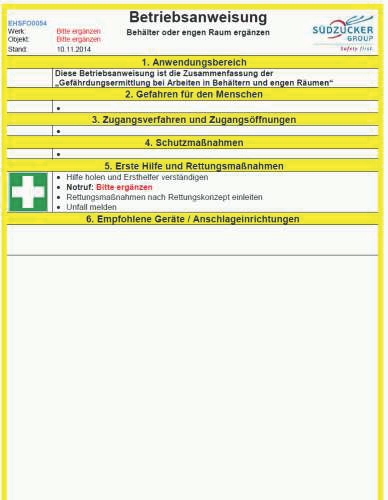 Zunächst wurde eine optimierte Mindestausstattung an Sicherheitsequipment zum Arbeiten und Retten spezifiziert. Weiterhin wurde eine Checkliste entwickelt, die als Hilfestellung für eine systematische Gefährdungsermittlung und die Erstellung der zugehörigen Betriebsanweisung je Behälter bzw. engem Raum herangezogen wird. Diese ist im Vorfeld der Arbeiten bezogen auf die Einstiegsstelle zu erstellen. In einer konkreten Arbeitssituation bildet sie dann eine wichtige Grundlage für das Ausfüllen des jeweiligen Erlaubnisscheines. Zur Vermittlung der Erkenntnisse und der künftigen Vorgehensweise durchliefen Teilnehmer aus allen Werken eine Multiplikatorenschulung. Dabei wurde zum einen die Vorgehensweise bei der Gefährdungsermittlung erläutert, zum anderen erfolgte ein praktisches Training mit den Arbeits- und Rettungsgeräten in den Anlagen des Werkes. Für alle vier Module des Sicherheitspaketes ist im firmeneigenen Intranet eine Arbeitsvorlage hinterlegt.