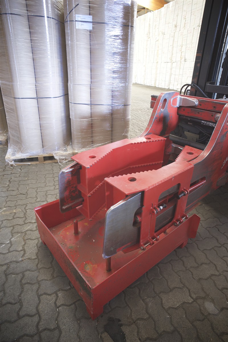 Über das Werksgelände der Baiersbronn Frischfaser Karton GmbH werden mit dem Ballenklammerstapler sowohl Zellstoffballen als auch Kartonausschussrollen transportiert. Mit der vorhandenen Ballenklammer kann es passieren, dass eine Kartonrolle verrutscht oder herausrutscht. Die Anschaffung eines neuen Staplers mit einer speziellen Rollenklammer war unwirtschaftlich und der Zeitaufwand für das Ummontieren des erforderlichen zusätzlichen Anbaugerätes gestaltete sich mit 20 bis 30 Minuten als zu hoch. In Betracht kam deshalb nur ein spezieller, neu entwickelter Aufsatz.