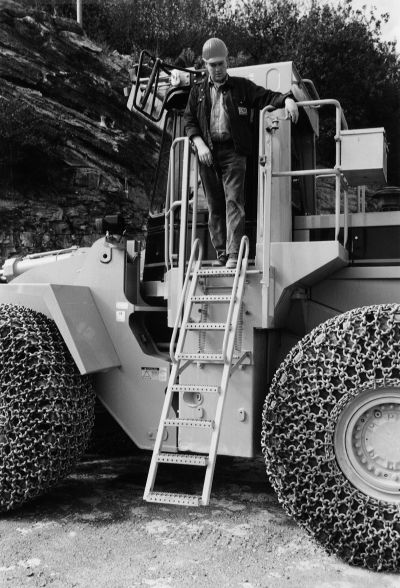Die von den Radladerherstellern serienmäßig angebotenen Aufstiegsleitern zu den Geräten verfügen in der Regel über eine beweglich angebrachte untere Stufe in einer Mindesthöhe von 0,65 m. Eine während der Fahrt senkrecht angebrachte Treppe wird zum Auf- bzw. Absteigen aus ihrer Arretierung gelöst. Hierbei entsteht einTreppenaufgang von ca. 75° Neigung mit rutschfesten Stufen, beidseitigem Handlauf und einer Mindesthöhe der unteren Stufe von 0,3 m über Erdniveau. Über einen Grenztaster ist sichergestellt, dass der Radlader nur in arretiertem Zustand der Treppe gestartet werden kann. Seit dem Einbau dieser Sicherheitseinrichtung ereignete sich kein Unfall im Zusammenhang mit dem Auf- und Absteigen und gleichzeitig wurde die Zufriedenheit der Mitarbeiter erhöht.