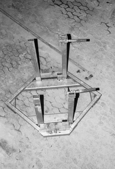 Die Idee war es, eine Einrichtung, die Unmaßtafeln verschiedener Bearbeitungsstufen sicher aufnehmen kann, zu entwickeln. Entstanden ist eine Vorrichtung mit wabenförmiger Grundfläche,die Unmaßplatten verschiedener Größe mit einem Gewicht von bis zu drei Tonnen aufnehmen kann. Die Rungen der Palette sind mit Spindeln zum Festsetzen der Platten versehen. Aufgrund ihrer wabenförmigen Grundfläche nehmen die Paletten wenig Platz in Anspruch und sind kippsicher. Da die Platten in den Paletten senkrecht eingespannt werden, stehen sie bruchsicher. Die Paletten können mit dem Gabelstapler sicher aufgenommen und transportiert werden.