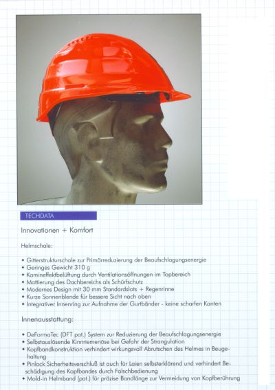 Oberfläche, scharfe Kanten im Innenraum der Helmschale wurden vermieden und die Belüftung ist zur Nutzung des Kamineffekts nicht seitlich positioniert, sondern dort wo die Luft mit typischer Arbeitshaltung des Trägers hineinsteigen bzw. die Helmschale verlassen wird. Ausserdem gibt es noch selbstöffnende Kiemriemenösen, damit die Gefahr der Strangulation für den Träger beseitigt wird. Es ist somit gelungen, ein durchdachtes Sicherheitskonzept zur Gestaltung eines Arbeitsschutzhelmes zu erstellen und auch durchzusetzen.