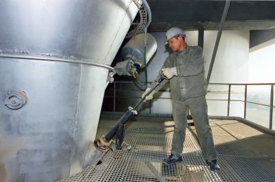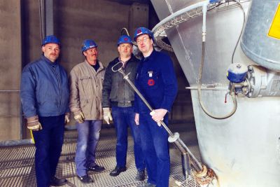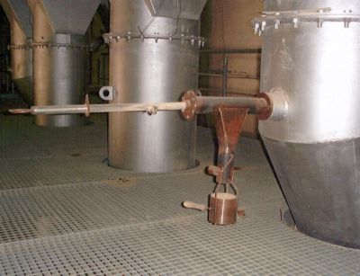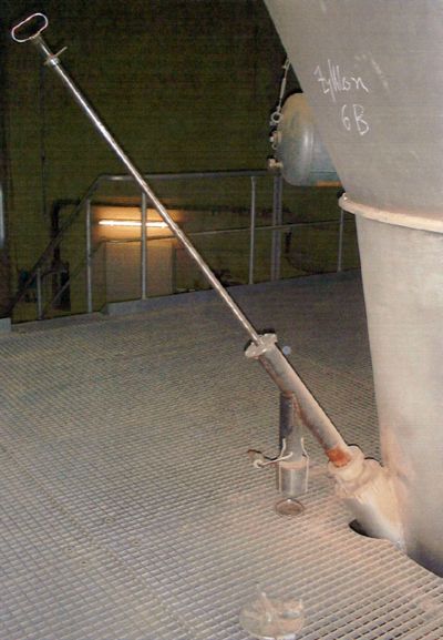 Von Zeit zu Zeit müssen Heißmehlproben im Wärmetauscherturm entnommen werden. Dabei kann es aufgrund des Fließverhaltens und der sehr hohen Temperaturen zu Brandverletzungen kommen. In einem Zementwerk wurde ein Probenehmer entwickelt der in einem geschlossenen System arbeitet. Dazu wird auf entsprechende Reinigungsöffnungen bzw. Cardoxstutzen ein Schleusenroh raufgesteckt. In diesem Schleusenrohr befindet sich ein sogenannter "Probelöffel", der über einen außerhalb angebrachten Handgriff in den Materialstrom hineingelassen wird. Nach Entnahme der Probe wird der Probelöffel zurück in das Schleusenrohr gezogen und oberhalb einer Auslassöffnung um 180°gedreht. Die Heißmehlprobe fällt nun durch die Auslassschleuse in ein Aufnahmegefäß. Mit dieser Einrichtung können Heißmehlproben sicher entnommen werden. Ein "Durchschießen" von Heißmehl während der Probenahme wird damit ausgeschlossen.